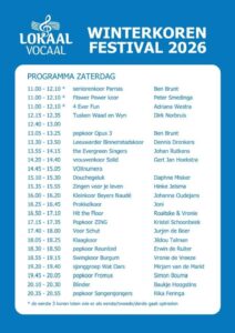 | 1. ABBA-medley 2. Always remember us this way 3. Angel 4. Another love 5. Blinding lights 6. Can’t stop the feeling 7. Don’t worry about me 8. Eltse grins foarby 9. Empire state of mind/New York 10. Family Tree 11. Fix You 12. Happy 13. Have i told you lately 14. Human 15. I heard it through the grapevine 16. I will survive 17. Ik heb je lief 18. In the arms of a angel 19. Joanne 20. L’oiseau et l’enfant 21. Leave a light on 22. Los pajaros perdidos 23. Lullaby 24. Mag ik dan bij jou 25. My immortal 26. No mercy |